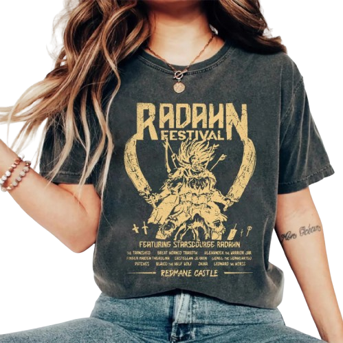 Le t-shirt Elden Ring “Radahn Festival” transforme l’un des moments les plus marquants du jeu en un design ultra stylé. Inspiré des t-shirts de tournée de groupes metal, il met en scène le Général Radahn – majestueux, terrifiant, prêt à faire tomber les étoiles. Avec sa fausse programmation et une référence au “Château du Lion Rouge”, ce t-shirt réussit à fusionner parfaitement l’univers fantasy et l’esprit festival.